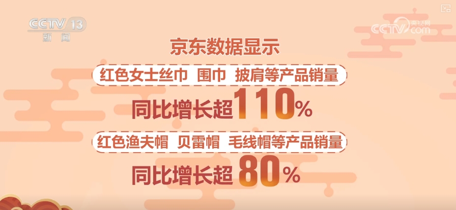 不僅是新年“戰(zhàn)袍”,新年配飾也要配齊。京東數(shù)據(jù)顯示,2025年,紅色的毛衣鏈銷量同比增長(zhǎng)超七倍,紅色手鏈、腳鏈、戒指銷量同比增長(zhǎng)超100%。也有很多用戶選擇用紅色帽子、圍巾來增添節(jié)日氛圍,紅色女士絲巾、圍巾、披肩等產(chǎn)品銷量同比增長(zhǎng)超110%,紅色漁夫帽、貝雷帽、毛線帽等產(chǎn)品銷量同比增長(zhǎng)也超過了80%。