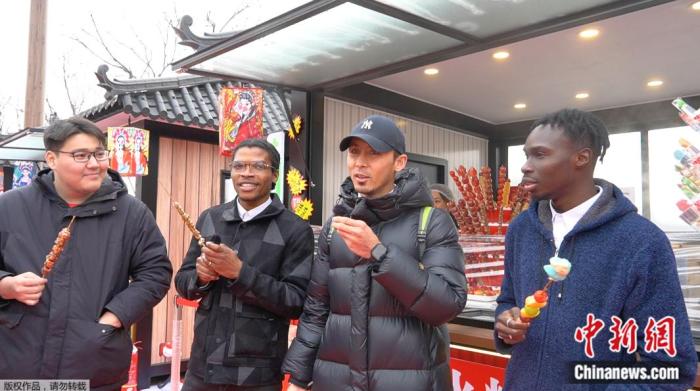 來自北京工業(yè)大學的四位留學生在北京通州大運河新春游園會上品嘗冰糖葫蘆。中新網(wǎng) 林勐男 攝