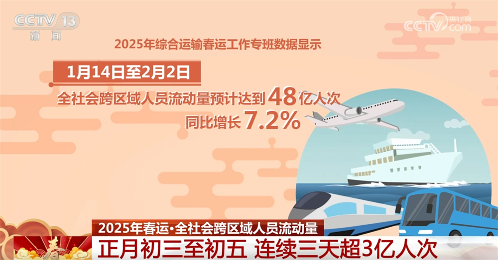 來自2025年綜合運輸春運工作專班數(shù)據(jù)顯示:1月14日至2月2日,全社會跨區(qū)域人員流動量預計達到48億人次,同比增長7.2%;正月初三、初四、初五已連續(xù)三天超3億人次,均超去年同期水平。