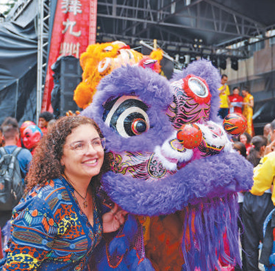當(dāng)?shù)貢r(shí)間2月1日,在巴西圣保羅市中心自由廣場(chǎng)舉辦的歡樂(lè)春節(jié)園游會(huì)開(kāi)幕式上,當(dāng)?shù)孛癖娕c舞獅表演者合影。記者 時(shí)元皓攝