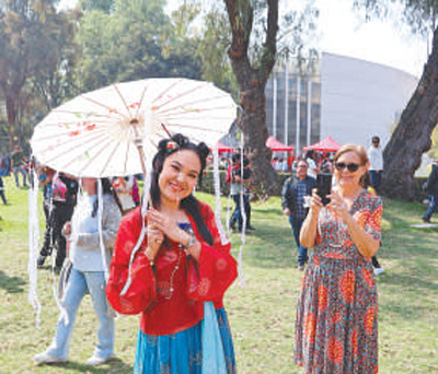 在墨西哥第四屆中國(guó)新年文化節(jié)上,當(dāng)?shù)厍嗄晟碇袊?guó)傳統(tǒng)服飾留影紀(jì)念。本報(bào)墨西哥分社 埃內(nèi)斯托·多明戈斯攝