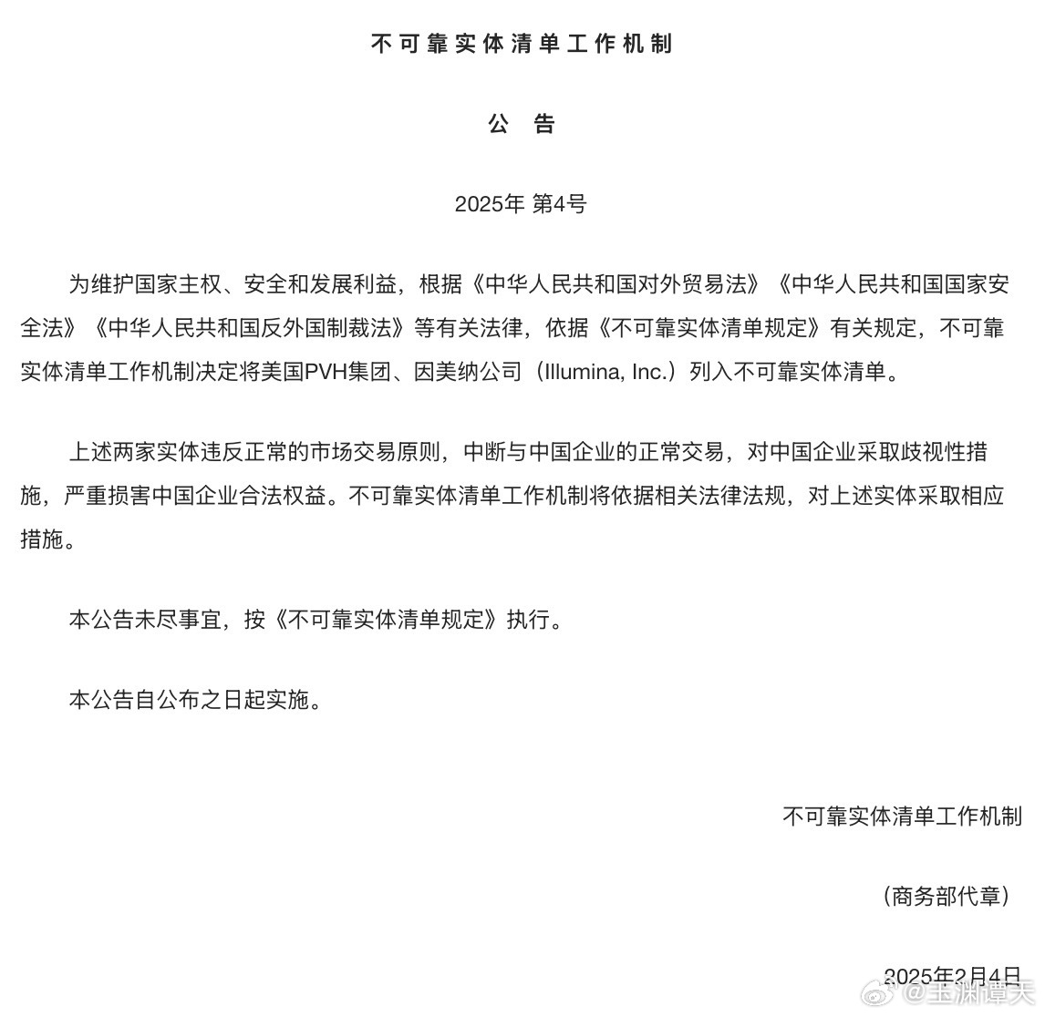 為維護(hù)國家主權(quán)、安全和發(fā)展利益,根據(jù)《中華人民共和國對外貿(mào)易法》《中華人民共和國國家安全法》《中華人民共和國反外國制裁法》等有關(guān)法律,依據(jù)《不可靠實體清單規(guī)定》有關(guān)規(guī)定,不可靠實體清單工作機(jī)制決定將美國PVH集團(tuán)、因美納公司(Illumina, Inc.)列入不可靠實體清單。