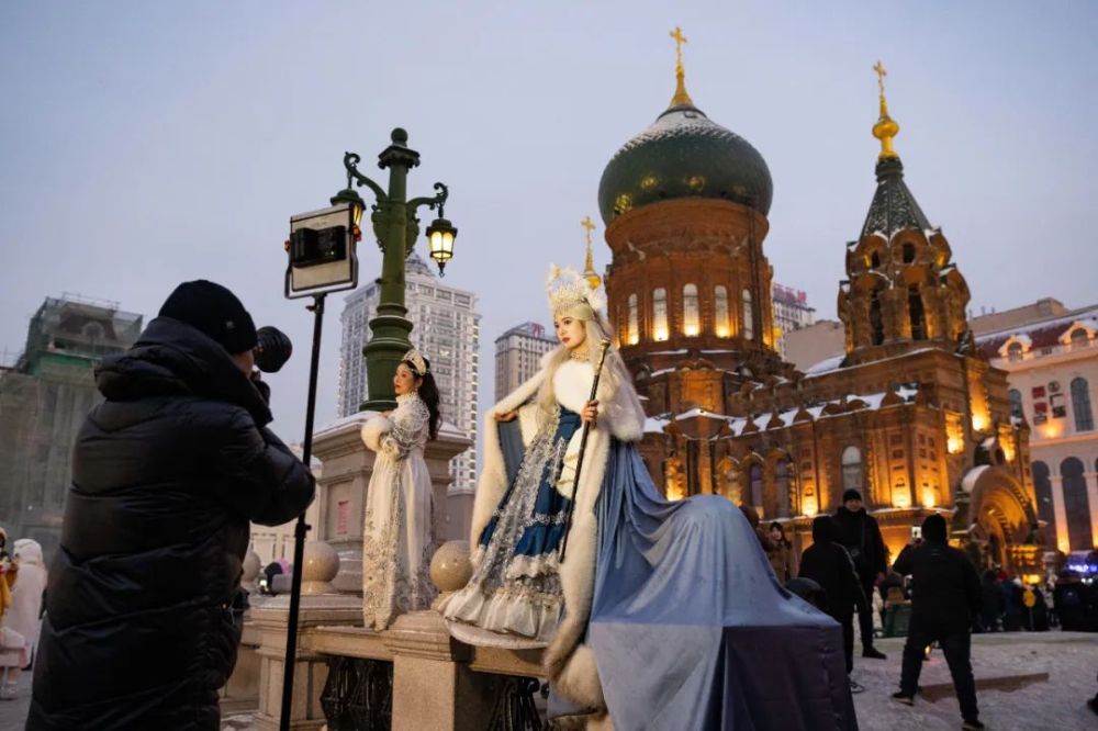 游客在哈爾濱建筑藝術(shù)廣場(chǎng)盛裝拍攝寫真。