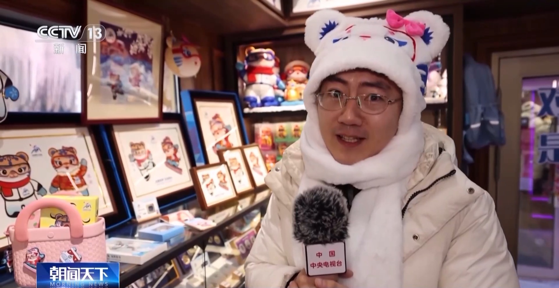 總臺記者 張程:我發(fā)現(xiàn)第九屆亞冬會的文創(chuàng)產(chǎn)品有兩個特點,第一就是完美地嵌入到我們的生活當(dāng)中:比如說我現(xiàn)在頭上戴的這頂妮妮圖案的帽子,采用了石墨烯加熱技術(shù),保證你在戶外也能夠抵御“爾濱”的嚴(yán)寒。
