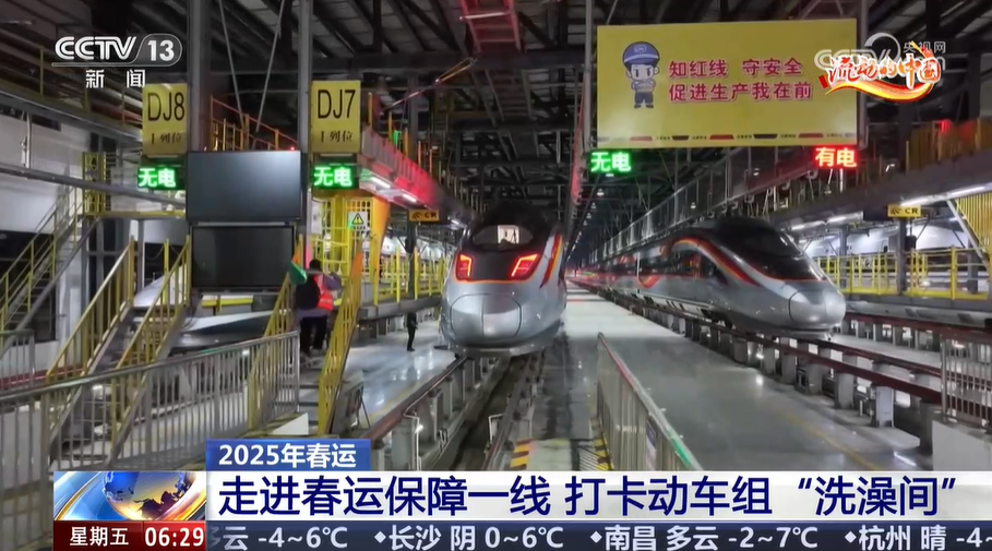 春運(yùn)期間,旅客平安出行的背后是數(shù)千組奔馳在祖國(guó)大江南北的動(dòng)車組。白天,列車日行千里,而到了午夜時(shí)分,它們就進(jìn)入專屬的“保養(yǎng)驛站”進(jìn)行必要的清洗工作。從里到外,保潔員們連夜給列車好好地“洗個(gè)澡”,確保次日干凈上線。接下來(lái),我們就跟隨記者的鏡頭一起去到江西南昌,打卡高鐵動(dòng)車組的“洗澡間”。