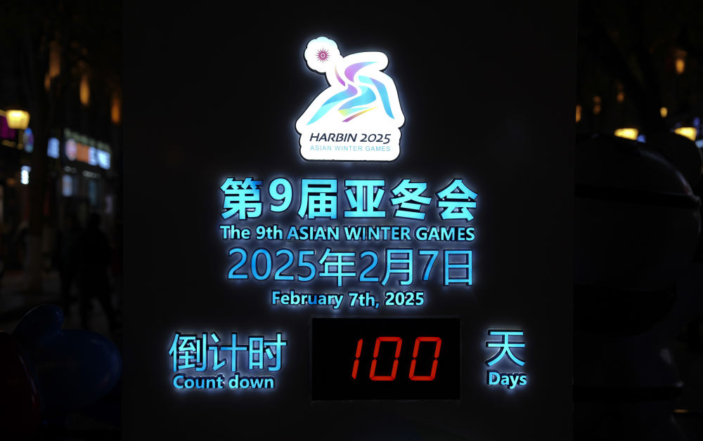 這是2024年10月30日在哈爾濱中央大街上拍攝的亞冬會倒計時牌。當日是2025年第九屆亞洲冬季運動會倒計時100天。