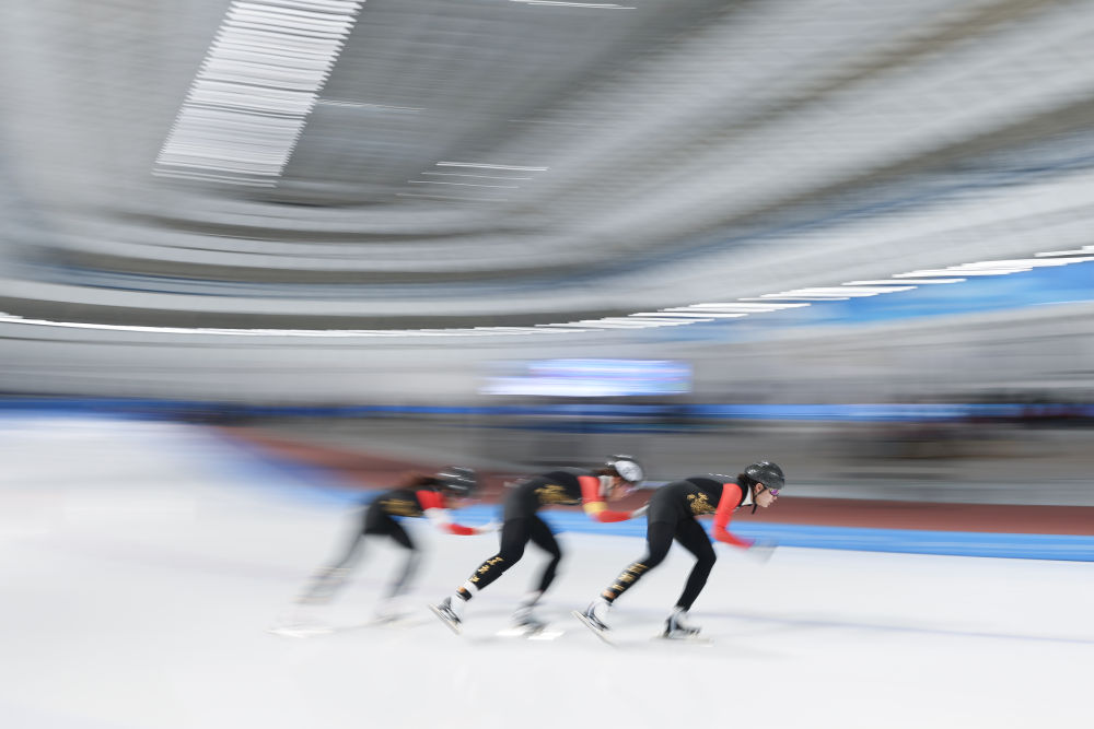 2024年12月15日,黑龍江省冰上訓練中心二隊選手在比賽中。當日,2024-2025賽季中國杯速度滑冰精英聯(lián)賽第四站暨亞冬會測試賽女子團體追逐比賽在黑龍江省冰上訓練中心舉行。
