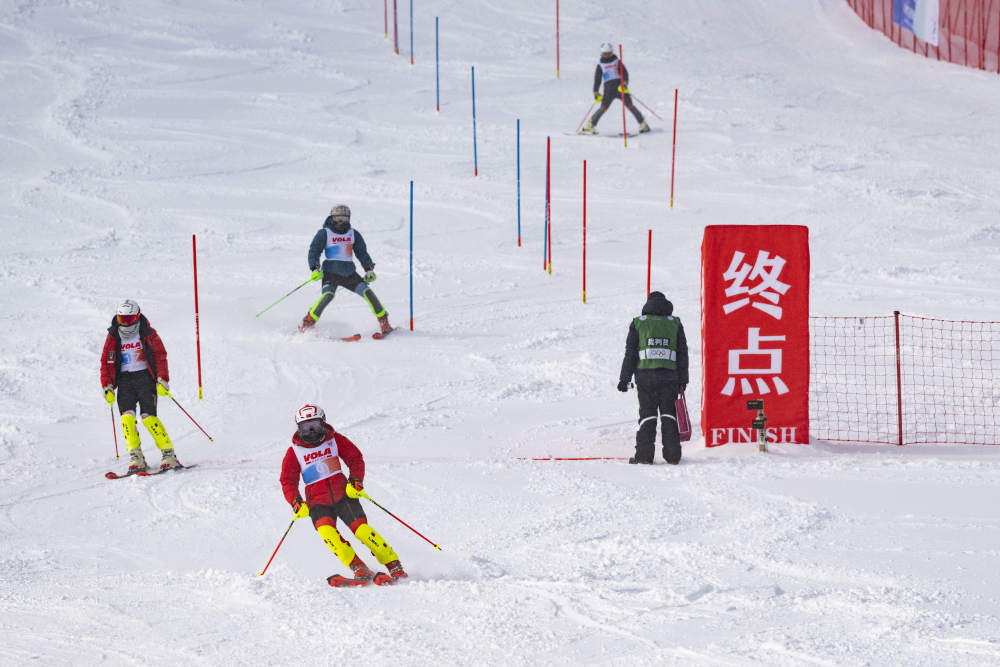 2024年12月22日,參賽選手在觀察男子回轉測試賽線路。當日,2025年哈爾濱亞洲冬季運動會高山滑雪項目測試賽在黑龍江省亞布力體育訓練基地(亞布力滑雪場)舉行。