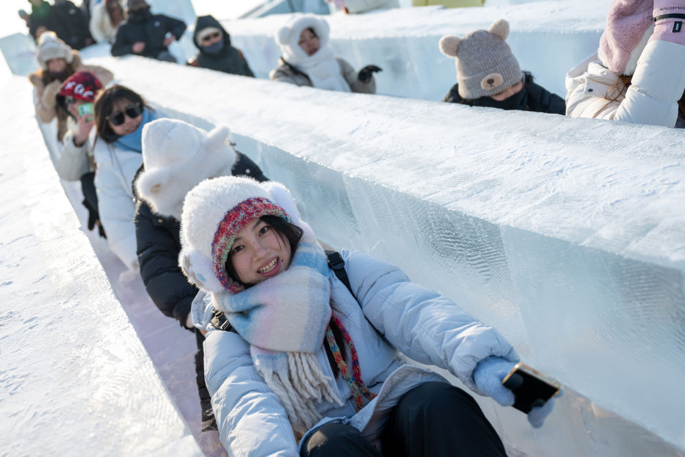 2024年12月21日,游客在哈爾濱冰雪大世界園區(qū)內玩滑梯。