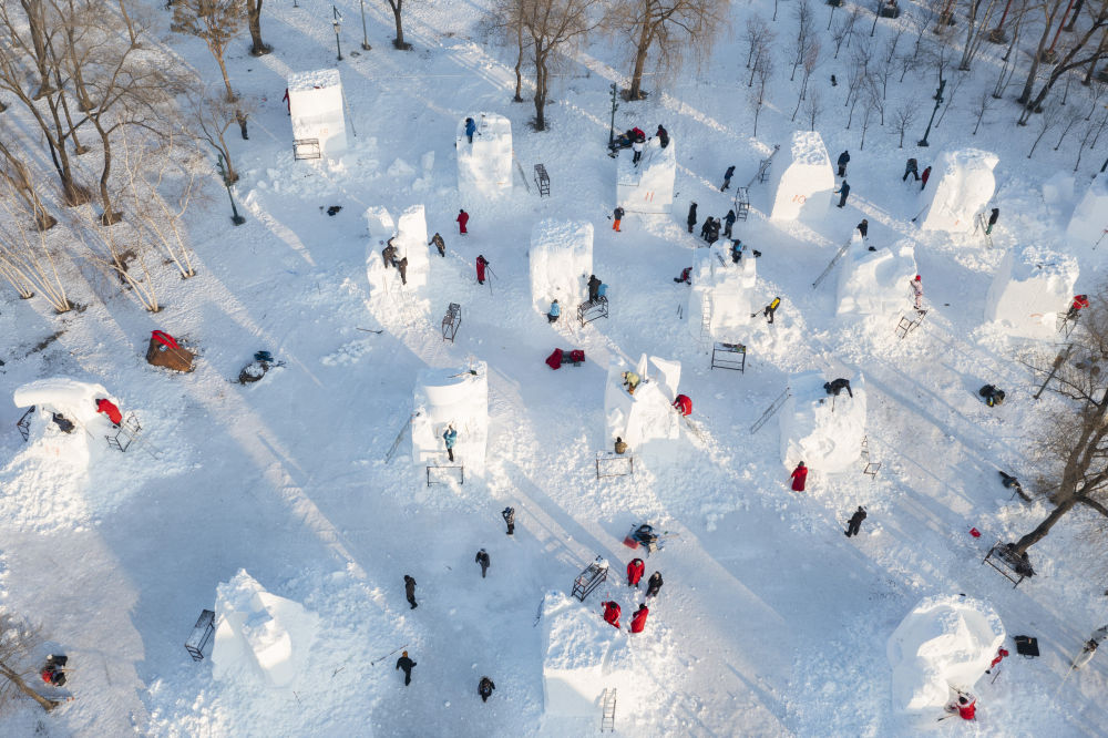 2025年1月6日,第27屆哈爾濱國際雪雕比賽參賽選手在雕刻雪雕作品。來自10個國家20余支代表隊的雪雕藝術家在哈爾濱太陽島雪博會園區(qū)同場競技。