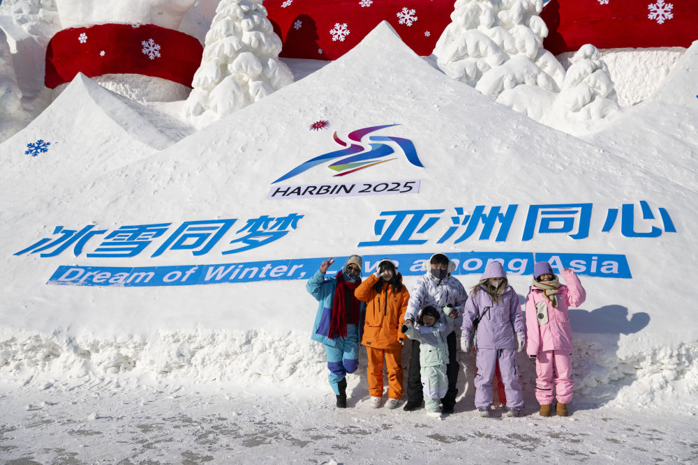2025年1月8日,在哈爾濱中央大街,游客在亞冬會倒計時景觀前拍照留念。當日,第九屆亞冬會迎來開幕倒計時30天。