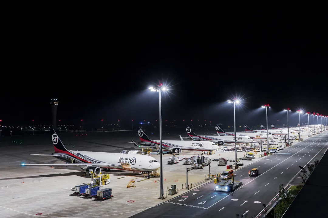 圖為夜幕下的花湖機(jī)場上,順豐航空的地勤人員正在繁忙作業(yè)。順豐鄂州樞紐供圖