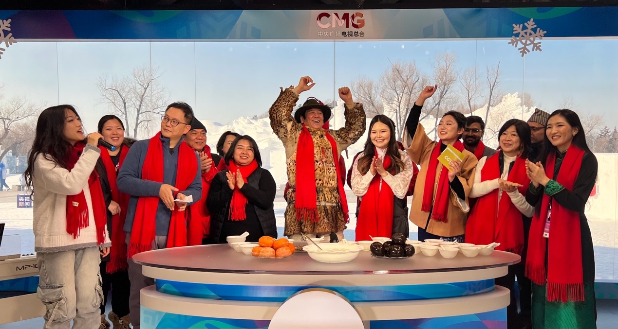 參加“當亞冬會遇上‘非遺年’”人文交流活動的中外嘉賓在哈爾濱太陽島雪博會CMG演播室同慶新春