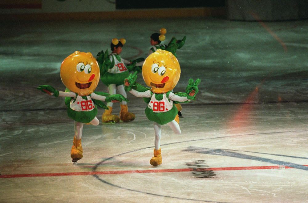 在哈爾濱舉行的第三屆亞冬會(huì)開幕式上,大型藝術(shù)表演《太陽(yáng)·冰雪·亞細(xì)亞》中,本屆亞冬會(huì)吉祥物豆豆伴隨著活潑的兒歌,在冰上歡快地滑行。新華社記者 羅更前 攝(傳真照片,1996年2月5日發(fā))