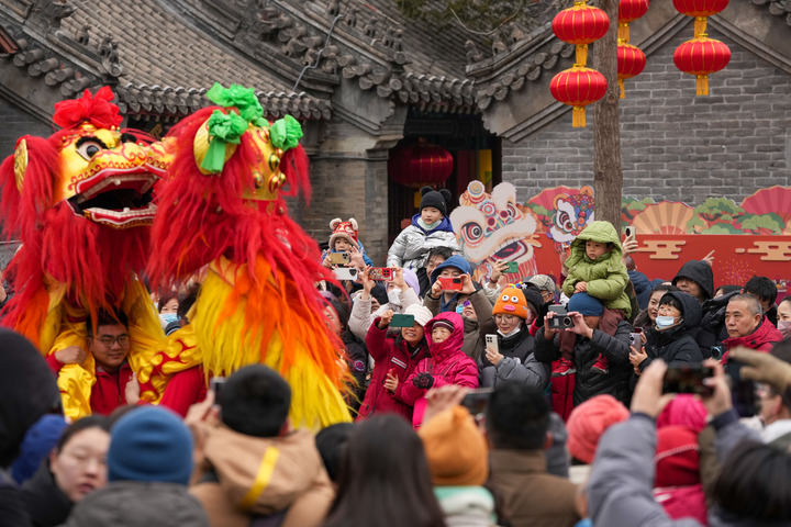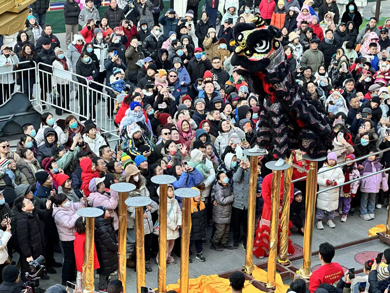 2月2日,在北京東岳廟廟會(huì),門(mén)前的北獅表演吸引眾多市民游客駐足觀看。一位家住附近的游客對(duì)記者表示:“過(guò)年期間這里的舞獅表演每天都不一樣,南獅北獅都有。看得真過(guò)癮!”