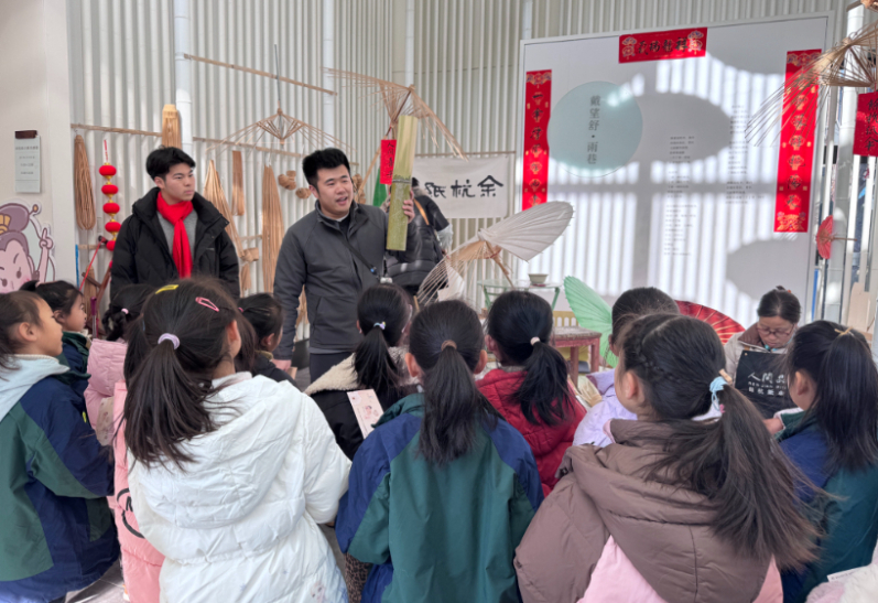余杭紙傘非遺工坊主理人劉偉學(xué)向孩子們介紹傘骨的制作方法。(受訪(fǎng)者供圖)
