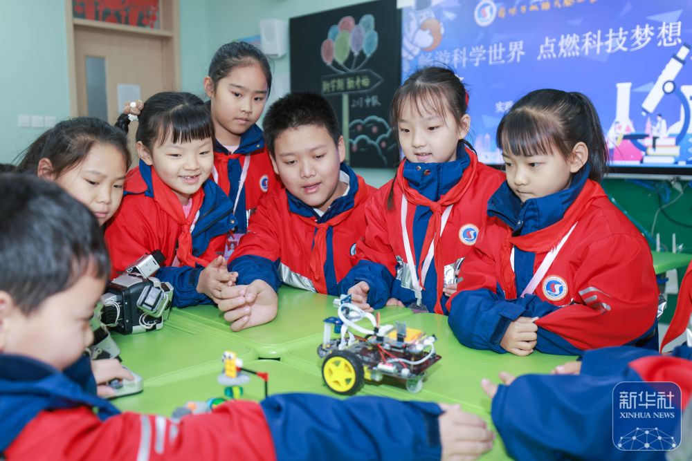 2月14日,在山東省棗莊市薛城區(qū)雙語(yǔ)實(shí)驗(yàn)小學(xué),學(xué)生們與編程機(jī)器人互動(dòng)。新華社發(fā)(王龍飛攝)