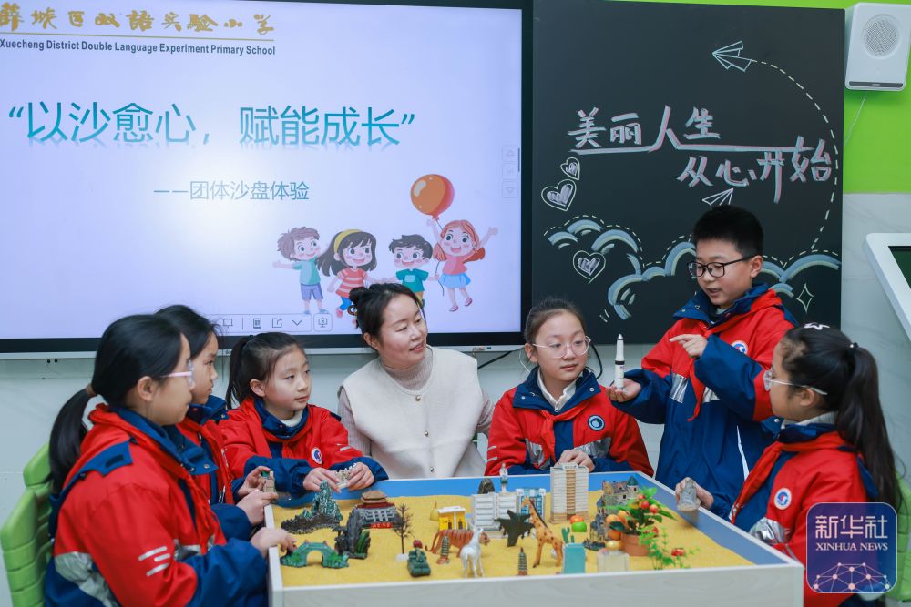2月14日,山東省棗莊市薛城區(qū)雙語(yǔ)實(shí)驗(yàn)小學(xué)老師為學(xué)生進(jìn)行心理健康教育。新華社發(fā)(王龍飛攝)