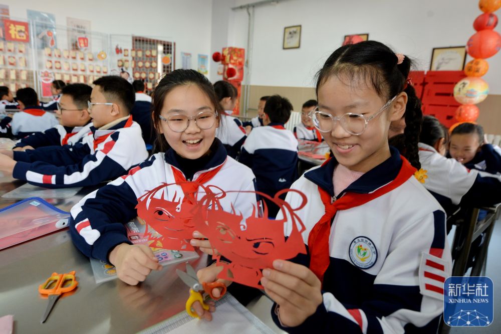 2月14日,兩名學(xué)生在山東青島宜陽(yáng)路小學(xué)“傳統(tǒng)文化潤(rùn)童心”主題活動(dòng)中學(xué)習(xí)“哪吒”剪紙。新華社發(fā)(王海濱攝)