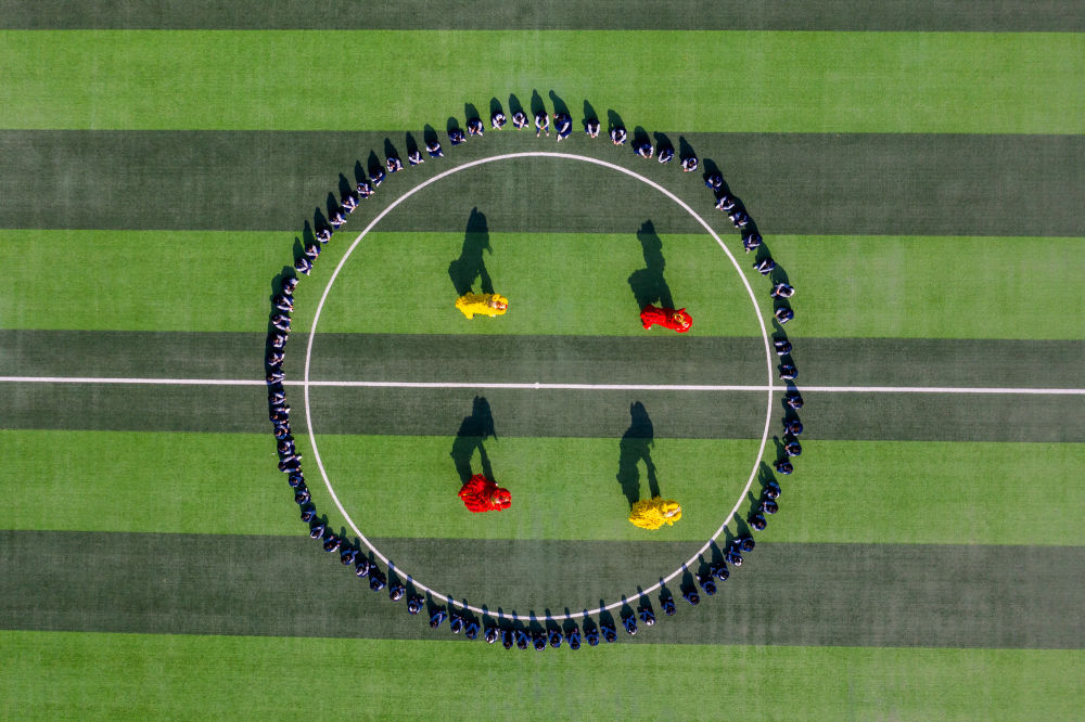 2月14日,山東省淄博科技學(xué)校龍獅社團(tuán)的學(xué)生在操場上進(jìn)行舞獅演練(無人機(jī)照片)。新華社發(fā)(張維堂攝)