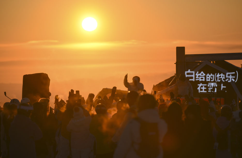 落日余暉灑在阿勒泰市將軍山國際滑雪度假區(qū)的山頂,漫山白雪被染成橙粉色。在現(xiàn)場電子音樂強勁的鼓點中,上千名滑雪愛好者歡呼搖擺,在零下十幾度的雪地里感受“蹦雪迪”的歡快。