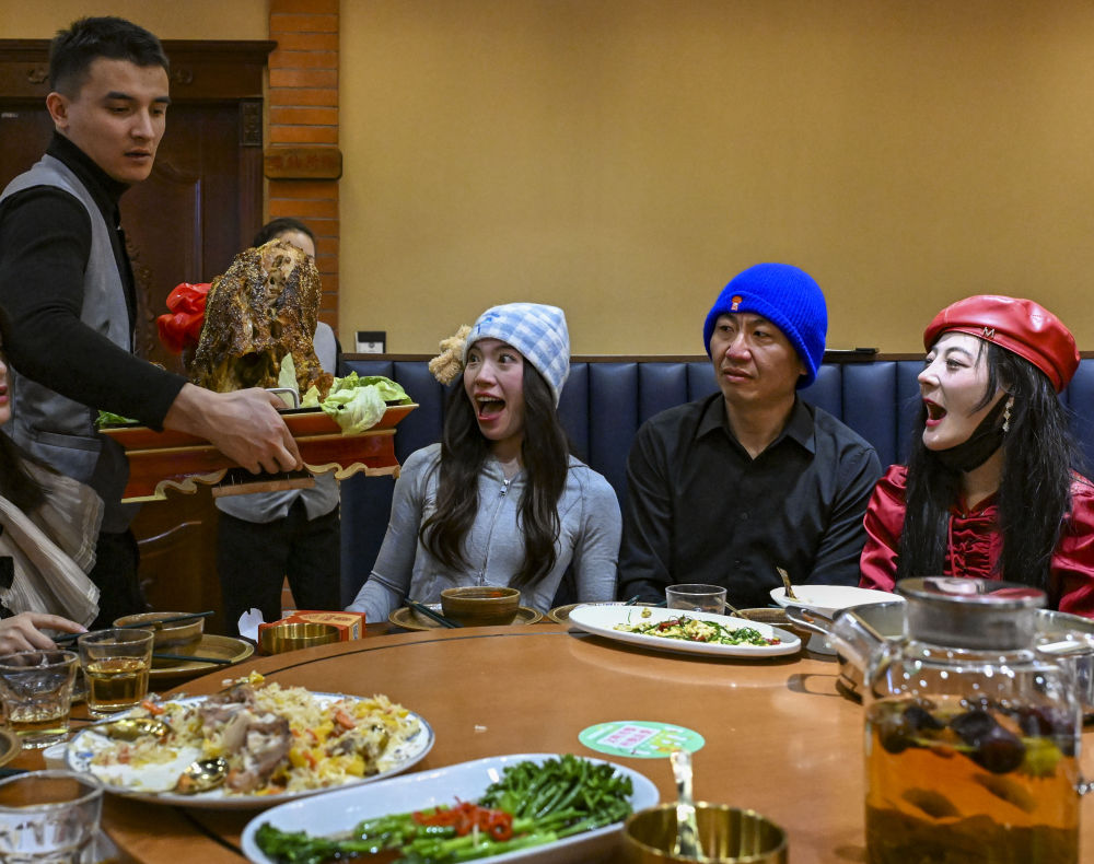 1月28日,雪友們在阿勒泰市區(qū)一家餐廳吃年夜飯。新華社記者 陳朔 攝