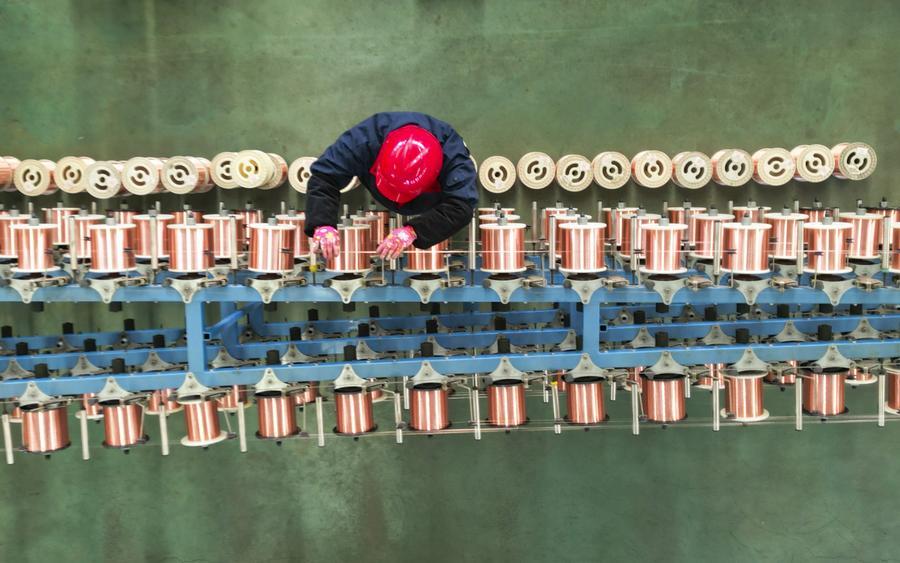 2月13日,在山東省東營市廣饒縣李鵲鎮(zhèn)的一家電纜公司的生產(chǎn)車間內(nèi),工人在進(jìn)行束絲作業(yè)(無人機照片)。新華社發(fā)(劉云杰攝)