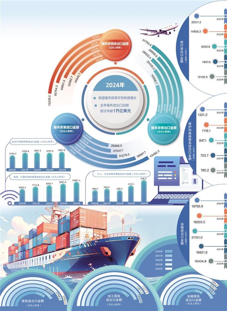 商務(wù)部數(shù)據(jù)顯示,2024年我國服務(wù)進出口總額達7.5萬億元人民幣,同比增長14.4%,服務(wù)貿(mào)易規(guī)模首次突破1萬億美元,再創(chuàng)歷史新高。我國服務(wù)貿(mào)易實現(xiàn)了令人矚目的快速增長,展示了經(jīng)濟發(fā)展的活力和韌性,背后是多個領(lǐng)域的協(xié)同發(fā)力。