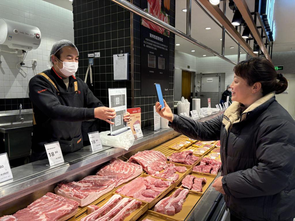 貴陽市一家豬肉生鮮門店內(nèi),消費者手機掃碼查看相關(guān)產(chǎn)品信息。新華社記者 李凡 攝