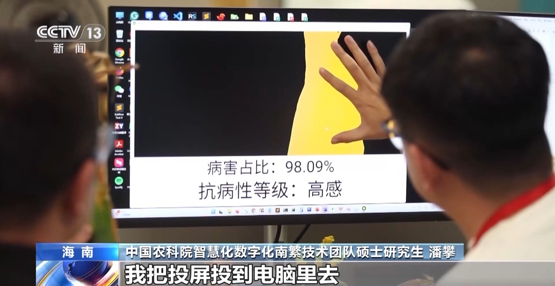 中國(guó)農(nóng)業(yè)科學(xué)院智慧化數(shù)字化南繁技術(shù)團(tuán)隊(duì)碩士研究生 潘攀:這上面的黃色的部分,就是有病害的部分,這個(gè)綠色的部分是,相當(dāng)于是沒(méi)有病害的部分。