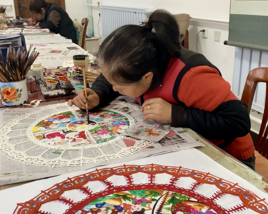 南張莊村阿姨正在點(diǎn)染剪紙。邢建榮 攝