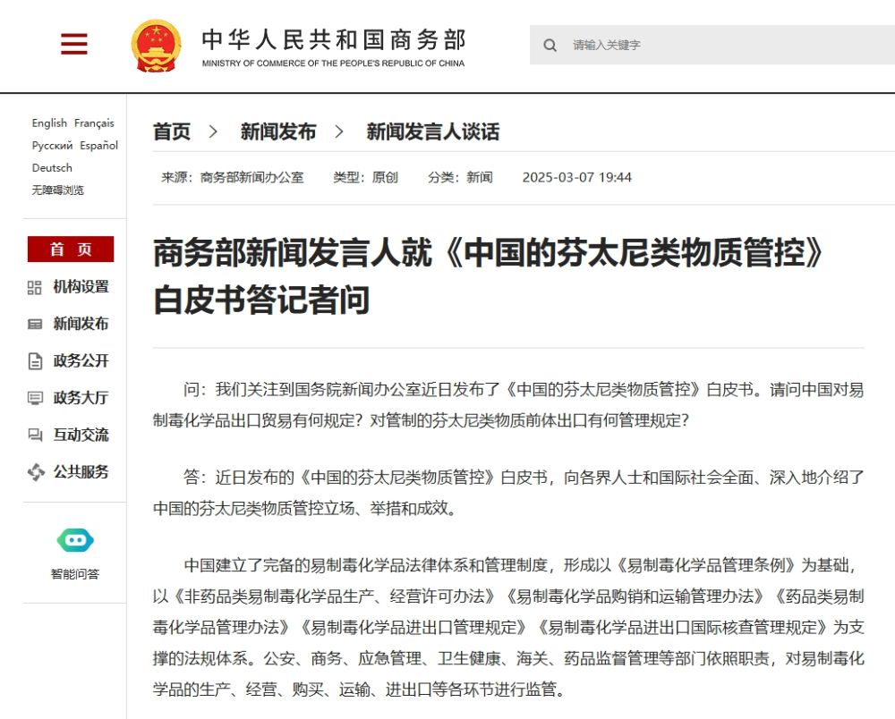 答:近日發(fā)布的《中國的芬太尼類物質(zhì)管控》白皮書,向各界人士和國際社會(huì)全面、深入地介紹了中國的芬太尼類物質(zhì)管控立場、舉措和成效。