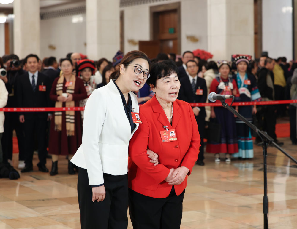 3月8日,第十四屆全國(guó)人民代表大會(huì)第三次會(huì)議第二場(chǎng)“代表通道”集中采訪活動(dòng)在北京人民大會(huì)堂舉行。這是全國(guó)人大代表盛弘(左)和楊寶玲向廣大婦女致以節(jié)日祝福。新華社記者 呂帥 攝