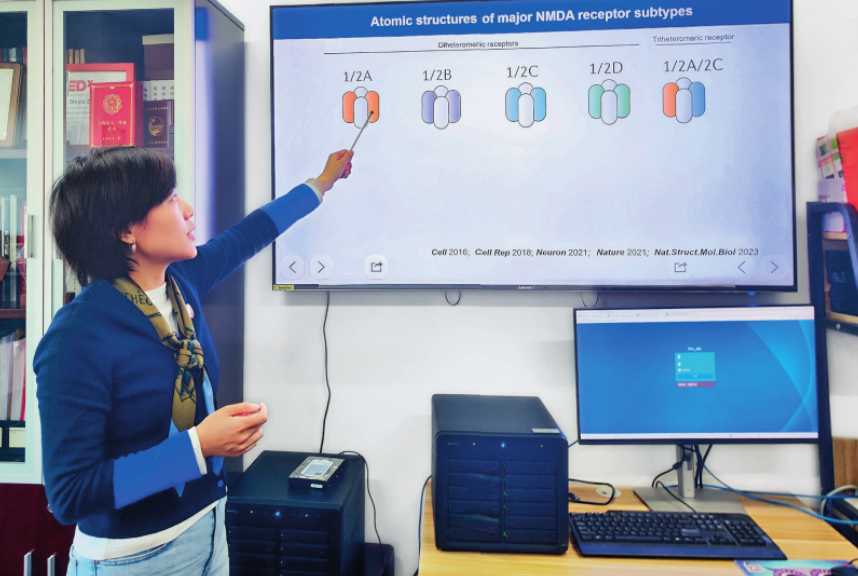 竺淑佳向記者介紹團(tuán)隊(duì)聚焦的NMDA受體相關(guān)研究(2025年1月攝)。董雪攝/本刊