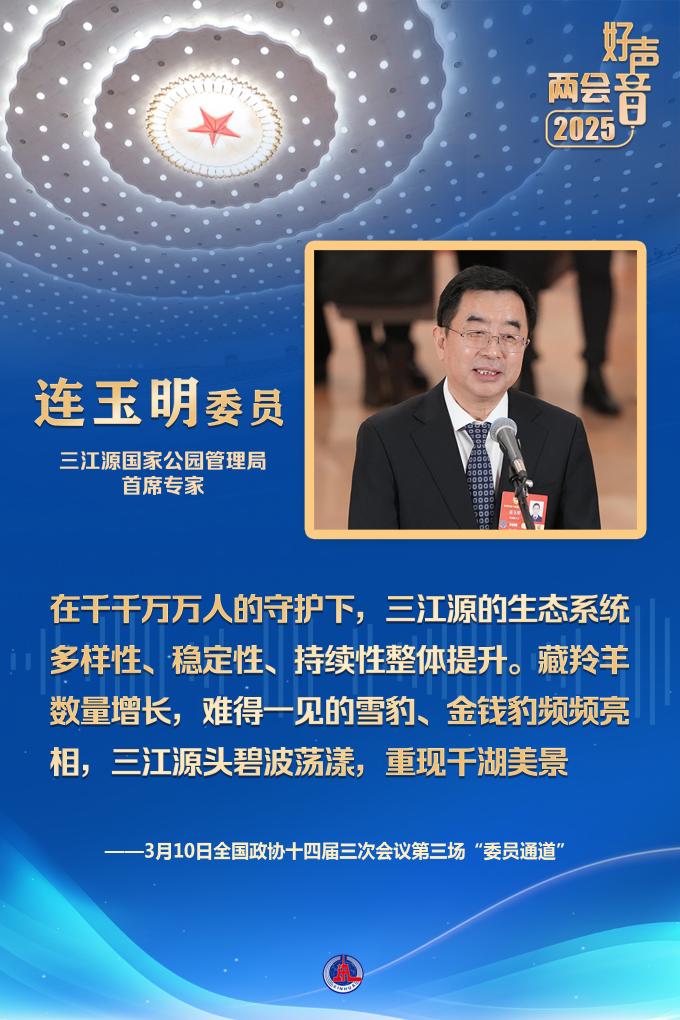 第一位回答記者提問的三江源國家公園管理局首席專家連玉明委員,是一名援青干部。他告訴大家,在三江源國家公園,有21432名生態(tài)管護員。在千千萬萬人的守護下,三江源的生態(tài)系統(tǒng)多樣性、穩(wěn)定性、持續(xù)性整體提升。藏羚羊數(shù)量增長,難得一見的雪豹、金錢豹頻頻亮相,三江源頭碧波蕩漾,重現(xiàn)千湖美景。