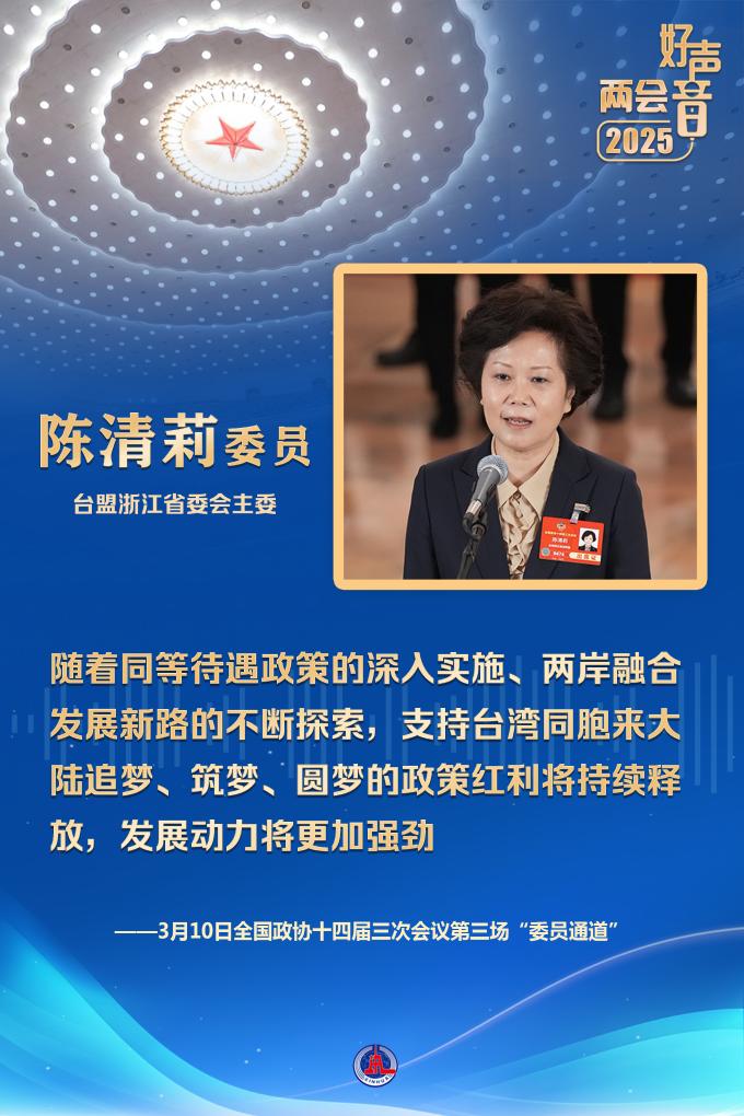 臺盟浙江省委會主委陳清莉委員分享了臺灣同胞在浙江生活、創(chuàng)業(yè)的故事。她表示,隨著同等待遇政策的深入實施、兩岸融合發(fā)展新路的不斷探索,支持臺灣同胞來大陸追夢、筑夢、圓夢的政策紅利將持續(xù)釋放,發(fā)展動力將更加強勁。