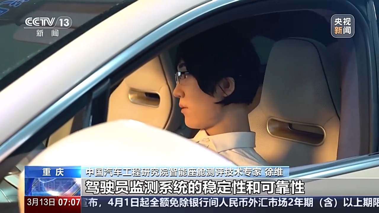 中國汽車工程研究院智能座艙測評技術專家 徐維:這個仿生機器人可以去模擬駕駛員的一些手勢動作,同時可以模擬我們眨眼睛、微笑等一些微表情,從而快速去檢測我們駕駛員監(jiān)測系統(tǒng)的穩(wěn)定性和可靠性。