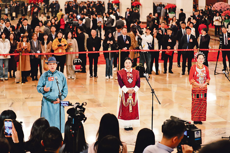 2025年3月10日,全國政協(xié)十四屆三次會議第三場“委員通道”在人民大會堂舉行。圖為少數(shù)民族委員亮相“委員通道”。 民族畫報記者 康夢婷/攝