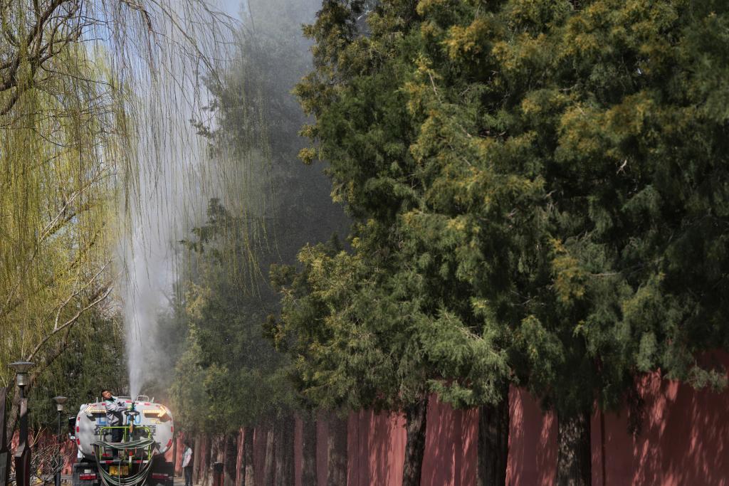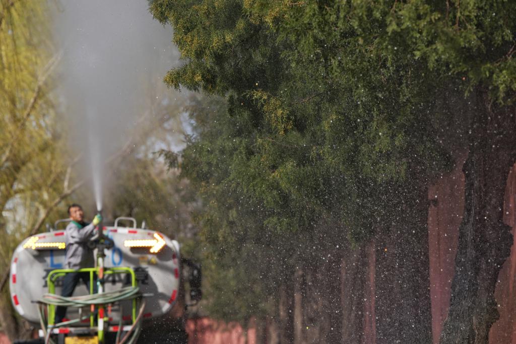 記者在位于北京東四環(huán)的紅領(lǐng)巾公園里看到,一輛水車尾燈雙閃、緩緩行進,站在車上的工作人員手持高壓水槍對圓柏開展沖淋作業(yè),花粉順著水流不斷落地。另一旁,園林工作人員對開花較多的枝條進行修剪。