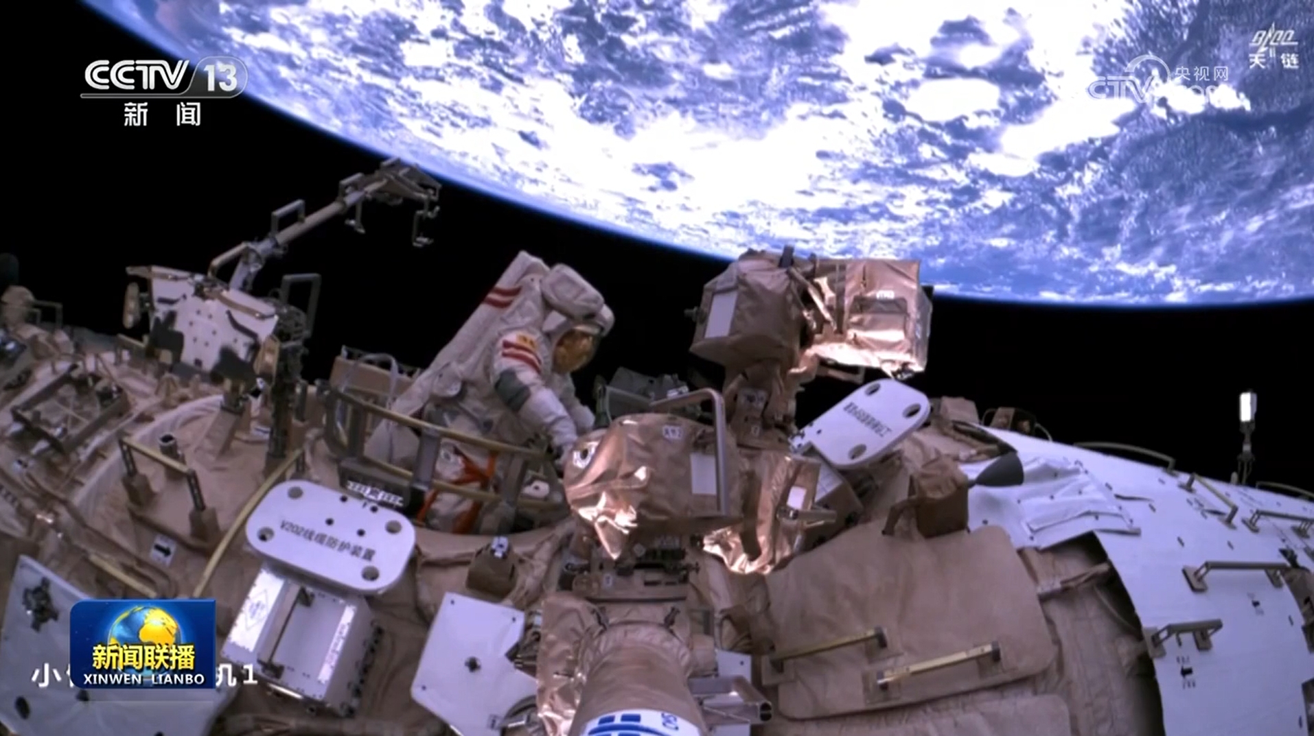 大約2個(gè)小時(shí)后,航天員宋令東也順利出艙,攀爬轉(zhuǎn)移至節(jié)點(diǎn)艙環(huán)形扶手處。隨著機(jī)械臂運(yùn)動(dòng)至艙外操作臺(tái)傳遞點(diǎn),宋令東配合蔡旭哲傳遞、安裝問(wèn)天艙和氣閘艙的防護(hù)裝置,并安裝節(jié)點(diǎn)艙固定裝置底座。航天員王浩澤在天和核心艙內(nèi)密切協(xié)同。