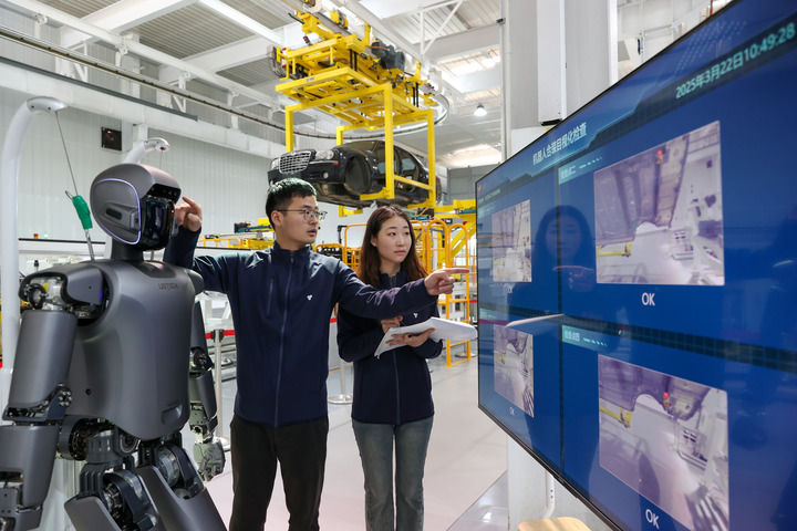 3月22日,在位于江蘇無錫的天奇股份人形機器人數(shù)據(jù)采集實訓基地,工程師在調(diào)試人形機器人。新華社發(fā)(朱吉鵬攝)
