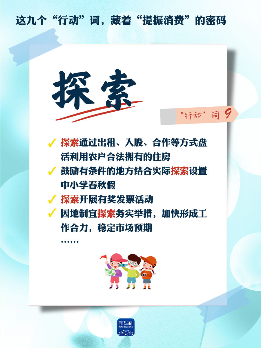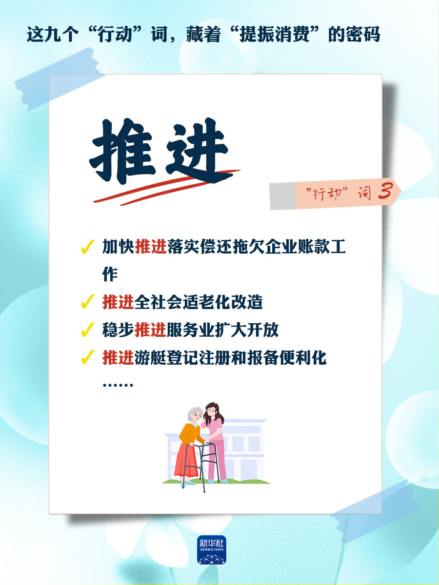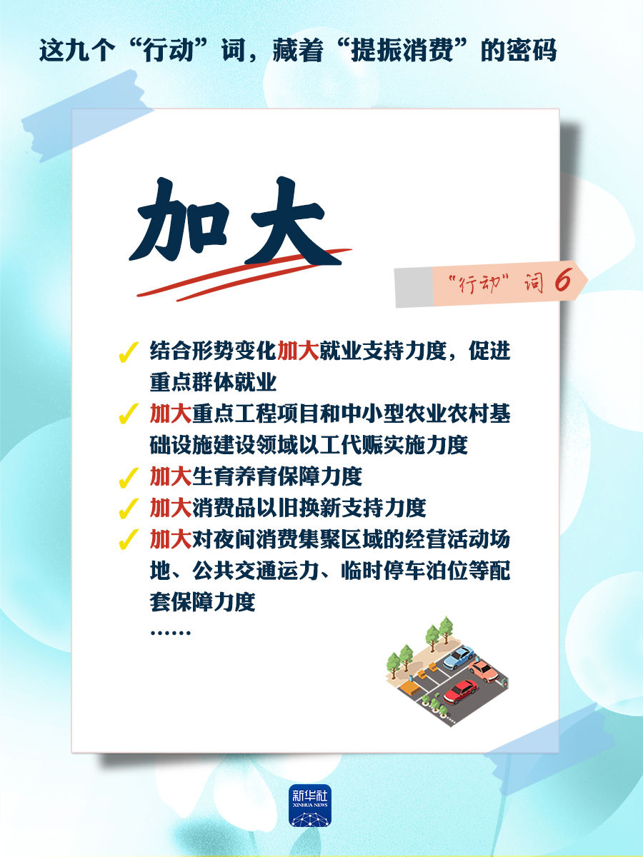我們梳理出“方案”中使用頻率較高的九個(gè)“行動(dòng)”詞,從這些不同維度的“行動(dòng)”詞中,解讀“專項(xiàng)行動(dòng)”的豐富內(nèi)涵和政策“含金量”,看看哪些是立竿見(jiàn)影、吹糠見(jiàn)米的惠民行動(dòng)?哪些是需要加力擴(kuò)圍、加快補(bǔ)齊的消費(fèi)短板?還有哪些是需要有序推進(jìn)、以點(diǎn)帶面的消費(fèi)“新”點(diǎn)?