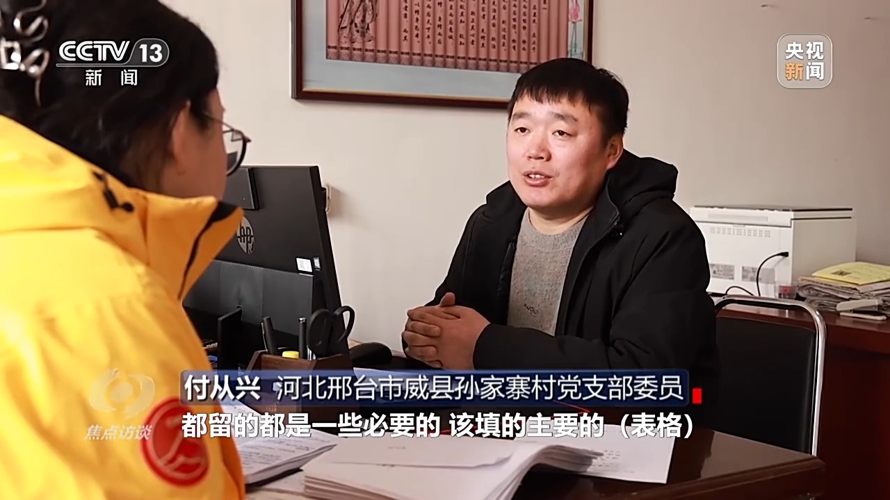 河北邢臺(tái)市威縣孫家寨村黨支部委員 付從興:現(xiàn)在各個(gè)部門(mén)表格減少了,都留的都是一些必要的、該填的主要的表格,我感覺(jué)這樣很好,很精簡(jiǎn),入戶有更多精力去給人家探索這些事情,人家家里確實(shí)發(fā)生什么困難,有多少收入,咱們的政策怎么能幫助人家。