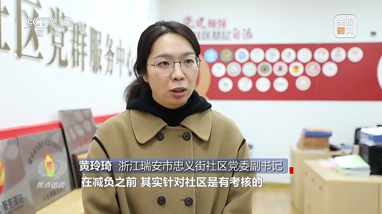 浙江瑞安市忠義街社區(qū)黨委副書(shū)記 黃玲琦:在減負(fù)之前,其實(shí)針對(duì)社區(qū)是有考核的,規(guī)定我們每個(gè)月要開(kāi)展八場(chǎng)活動(dòng),不可能一整個(gè)月都在那里辦活動(dòng)不開(kāi)展日常服務(wù),我只能是有一些活動(dòng)拿過(guò)來(lái)湊。要想考核好,只能?chē)@著考核細(xì)則轉(zhuǎn),沒(méi)辦法。