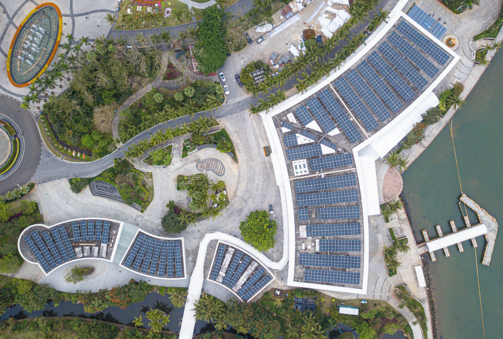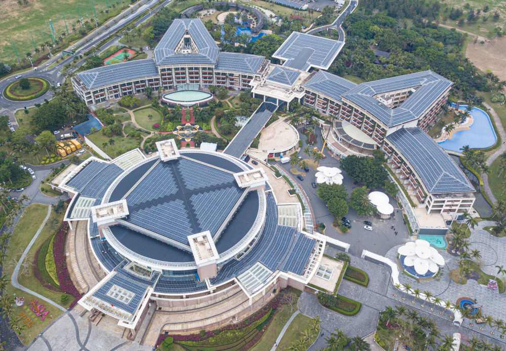 在博鰲零碳示范區(qū)拍攝的博鰲亞洲論壇國(guó)際會(huì)議中心和博鰲亞洲論壇大酒店屋頂?shù)墓夥O(shè)備(無(wú)人機(jī)照片,3月16日攝)。