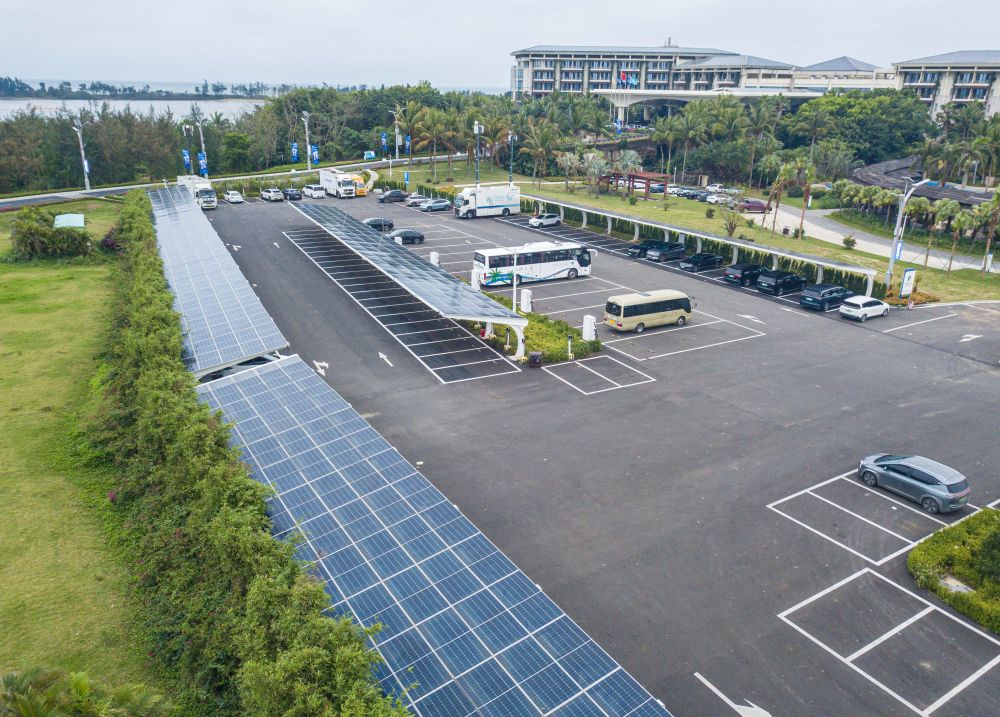 在博鰲零碳示范區(qū)拍攝的建有光伏發(fā)電設(shè)備的停車場(chǎng)(無(wú)人機(jī)照片,3月16日攝)。