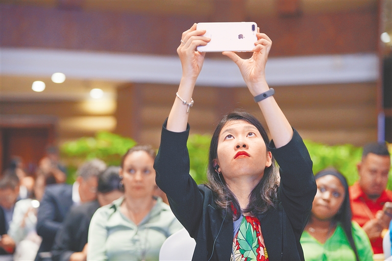 在全球自由貿(mào)易港發(fā)展論壇現(xiàn)場,與會嘉賓用手機(jī)記錄。海南日報(bào)全媒體記者 王程龍 攝