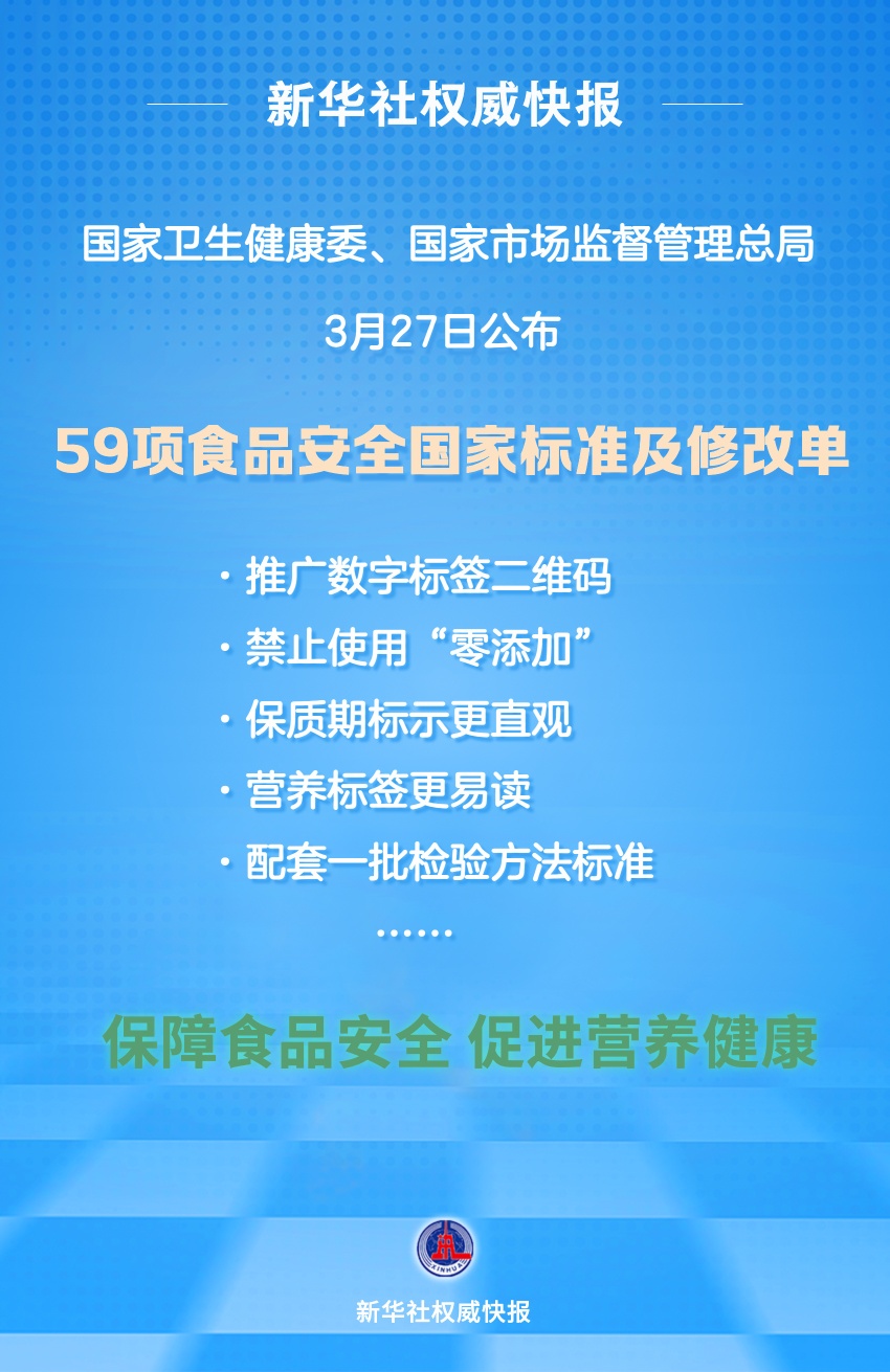 國家衛(wèi)生健康委、國家市場監(jiān)督管理總局3月27日公布了50項食品安全國家標準和9項標準修改單,這些標準與公眾日常消費的乳制品、肉制品、特殊醫(yī)學用途嬰兒配方食品、嬰幼兒輔助食品、食品添加劑、消毒劑等密切相關。