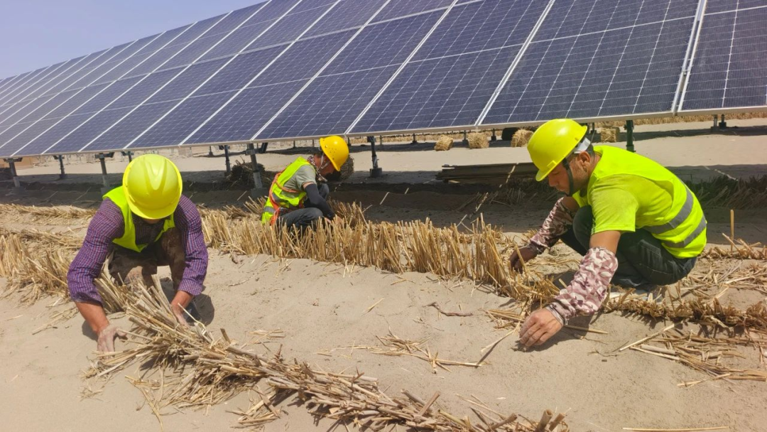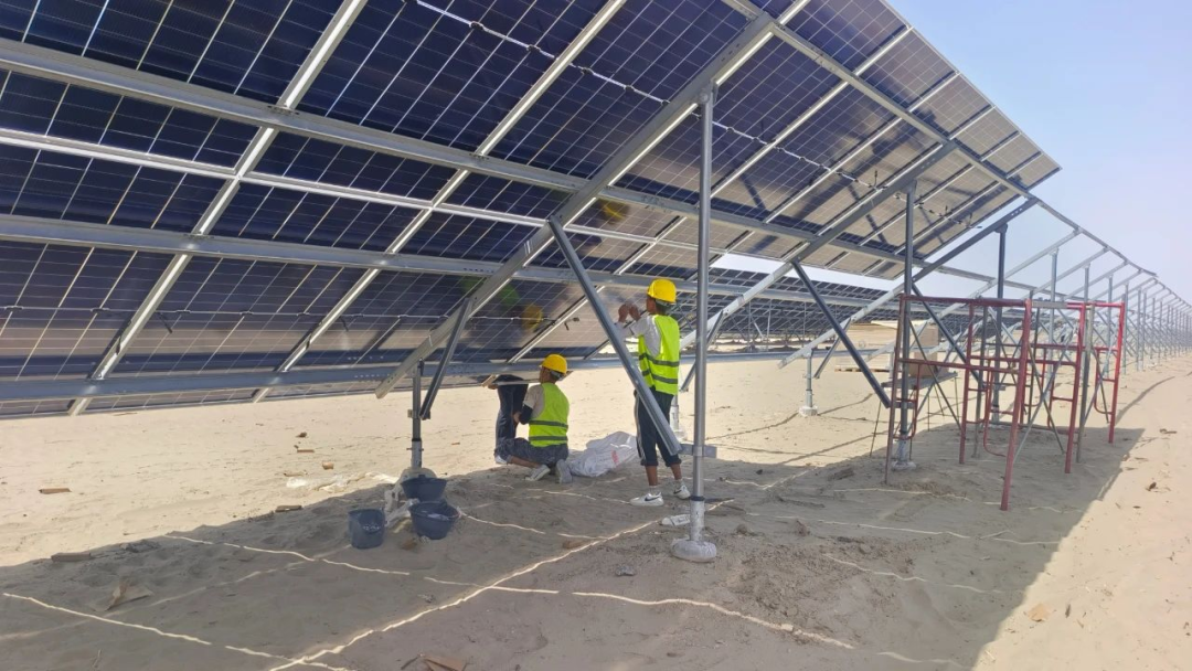 3月28日,在中國(guó)電建集團(tuán)新疆分公司新能源公司沙雅縣25萬(wàn)千瓦光伏項(xiàng)目施工現(xiàn)場(chǎng),工人們正緊張地安裝光伏板,周圍草方格的鋪設(shè)及梭梭的栽種也在同步開展當(dāng)中。該項(xiàng)目施工負(fù)責(zé)人郝澤權(quán)說(shuō),光伏發(fā)電助力機(jī)電井抽取沙漠地表百米以下的微咸水灌溉梭梭林,解決了長(zhǎng)期以來(lái)沙漠植綠缺水難題,實(shí)現(xiàn)生態(tài)與經(jīng)濟(jì)的雙重收益。