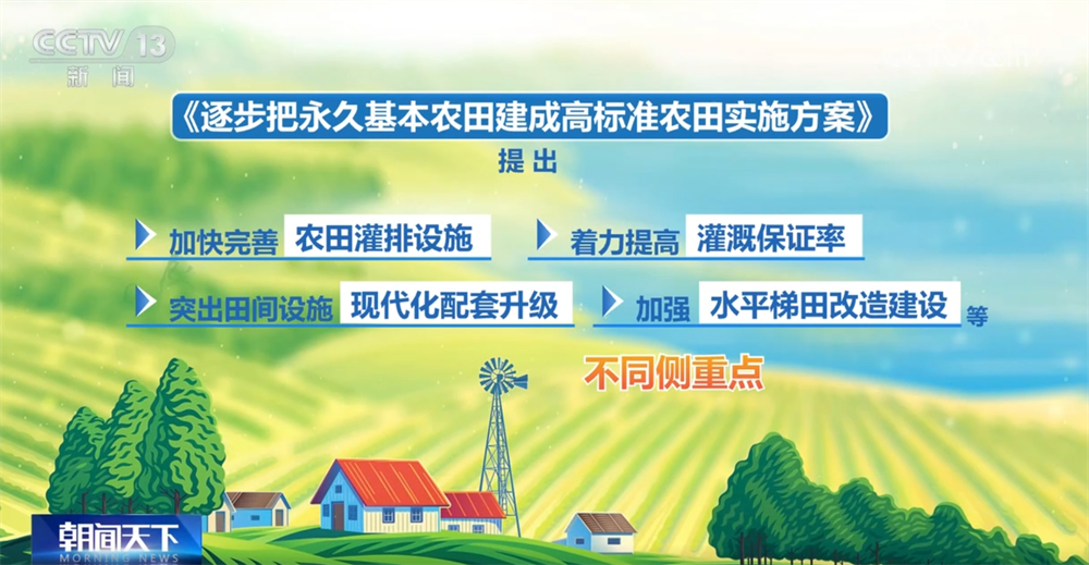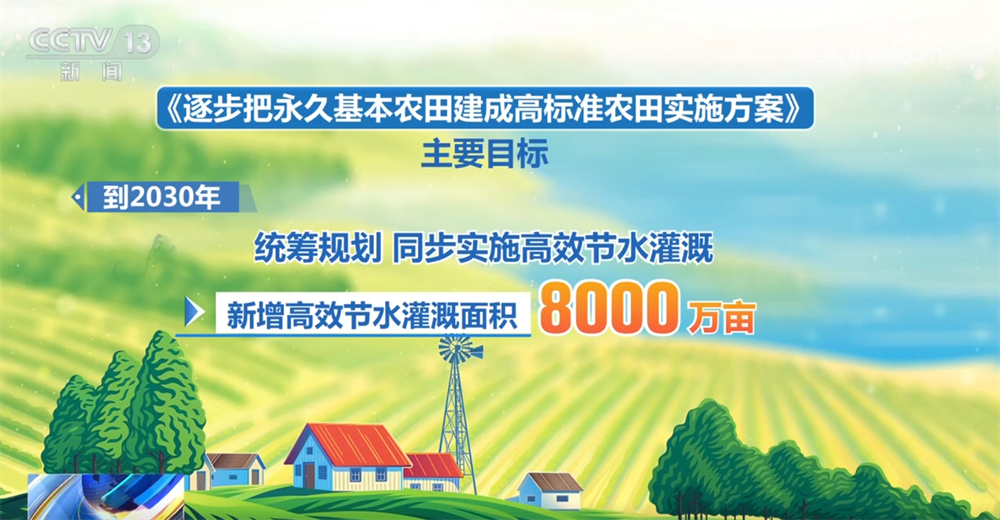 《實(shí)施方案》的主要目標(biāo)是:到2030年,力爭累計(jì)建成高標(biāo)準(zhǔn)農(nóng)田13.5億畝,累計(jì)改造提升2.8億畝,統(tǒng)籌規(guī)劃、同步實(shí)施高效節(jié)水灌溉,新增高效節(jié)水灌溉面積8000萬畝;到2035年,力爭將具備條件的永久基本農(nóng)田全部建成高標(biāo)準(zhǔn)農(nóng)田,累計(jì)改造提升4.55億畝,新增高效節(jié)水灌溉面積1.3億畝。